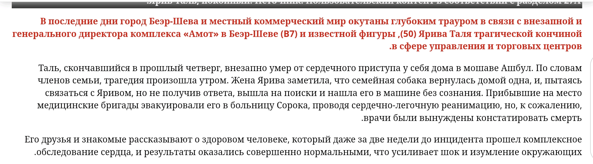 Feb. 19th, 2026 09:21 am Совершенно внезапно от остановки сердца умер гендир ТЦ в Беэр Шеве Ярив Таль. (50 лет).